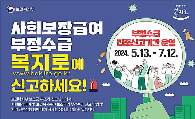 보건복지부는 5월13일부터 7월12일까지 2개월간 사회보장급여 부정수급 집중신고기간을 운영한다고 밝혔다.