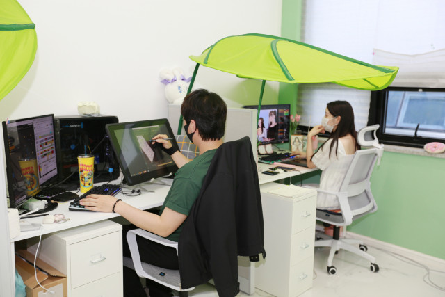 전남콘텐츠기업육성센터 지원기업 그린프로덕션 직원들이 애니메이션 작업을 하고 있다